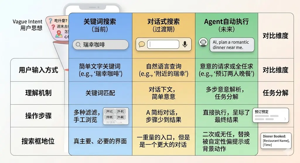 對美團(tuán)而言,這意味著搜索框的替代將是一個漸進(jìn)式、不可逆的過程。用戶一旦體驗(yàn)過“說人話就能找到想要的餐廳”,他們不會再愿意回到拼關(guān)鍵詞加撥篩選器的舊交互模式。