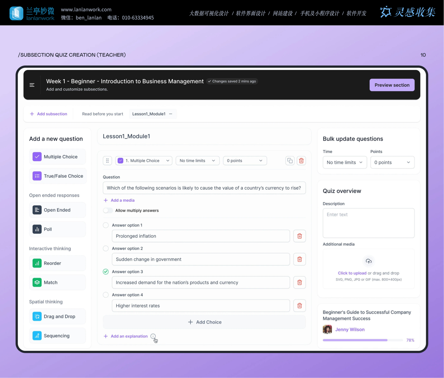 按鈕,操作反饋及時(shí)又明確;老師創(chuàng)建測(cè)驗(yàn)時(shí),能選多種題型,還能添加圖片等媒體、設(shè)置答題時(shí)間和分?jǐn)?shù),滿
