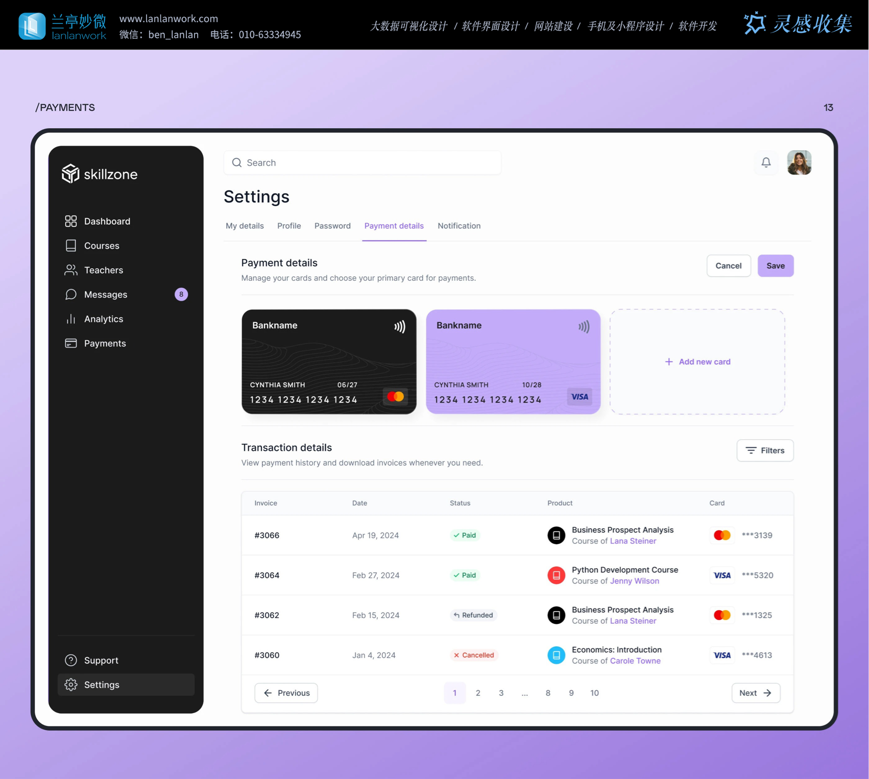 師)" 等功能,老師和學(xué)生能一鍵直達(dá)想去的板塊。主內(nèi)容區(qū)按功能模塊化,比如支付頁(yè)面,銀行卡信息用卡片