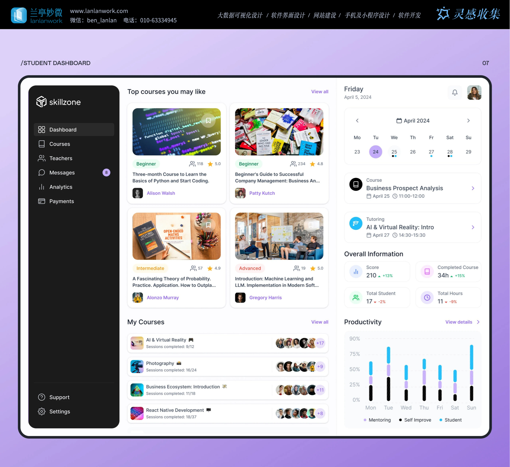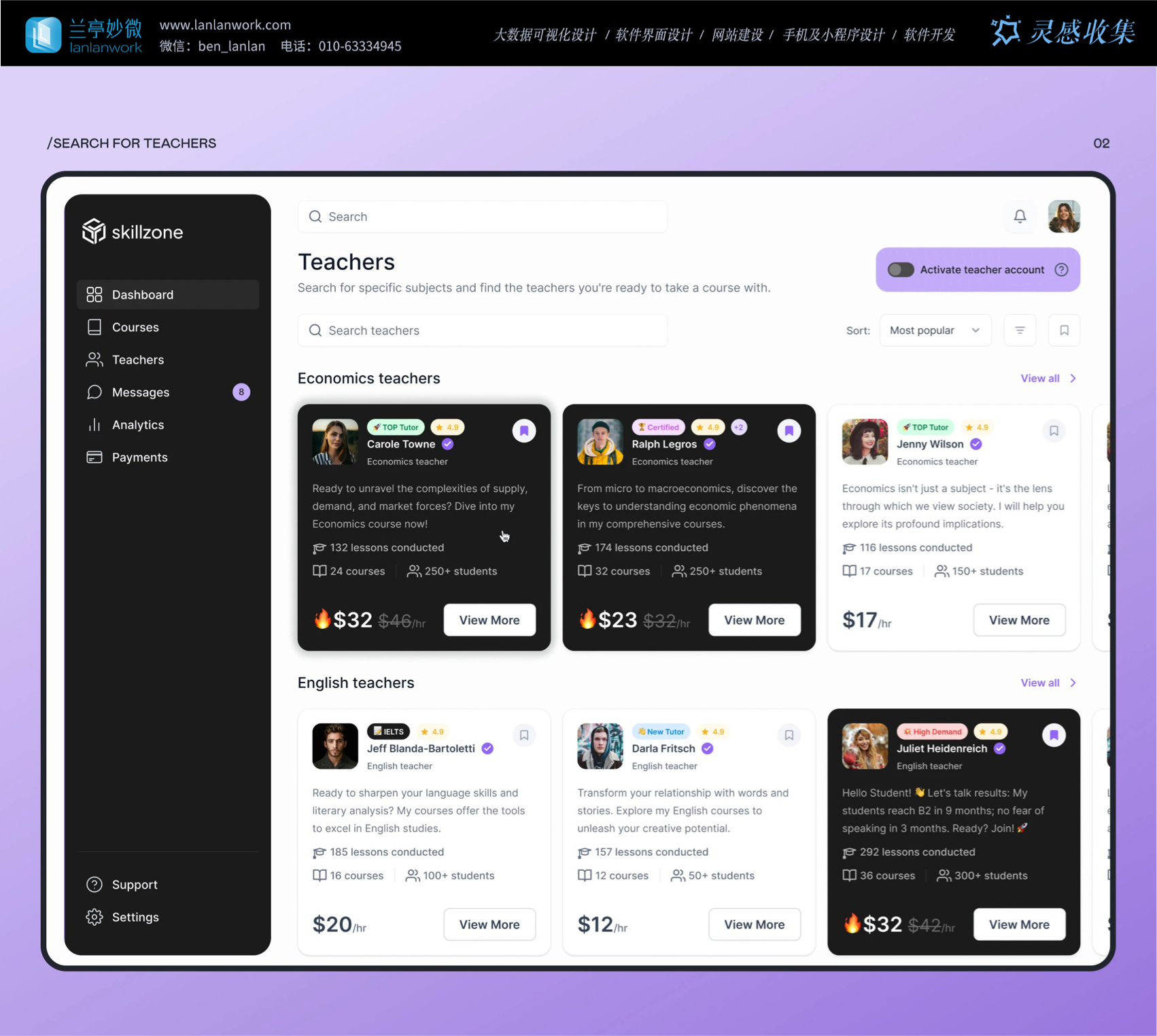 Skillzone 選用柔和的紫色為主色調(diào),紫色常給人智慧、有創(chuàng)造力的的感覺(jué),很符合教育的特點(diǎn)。再搭配簡(jiǎn)潔的黑白