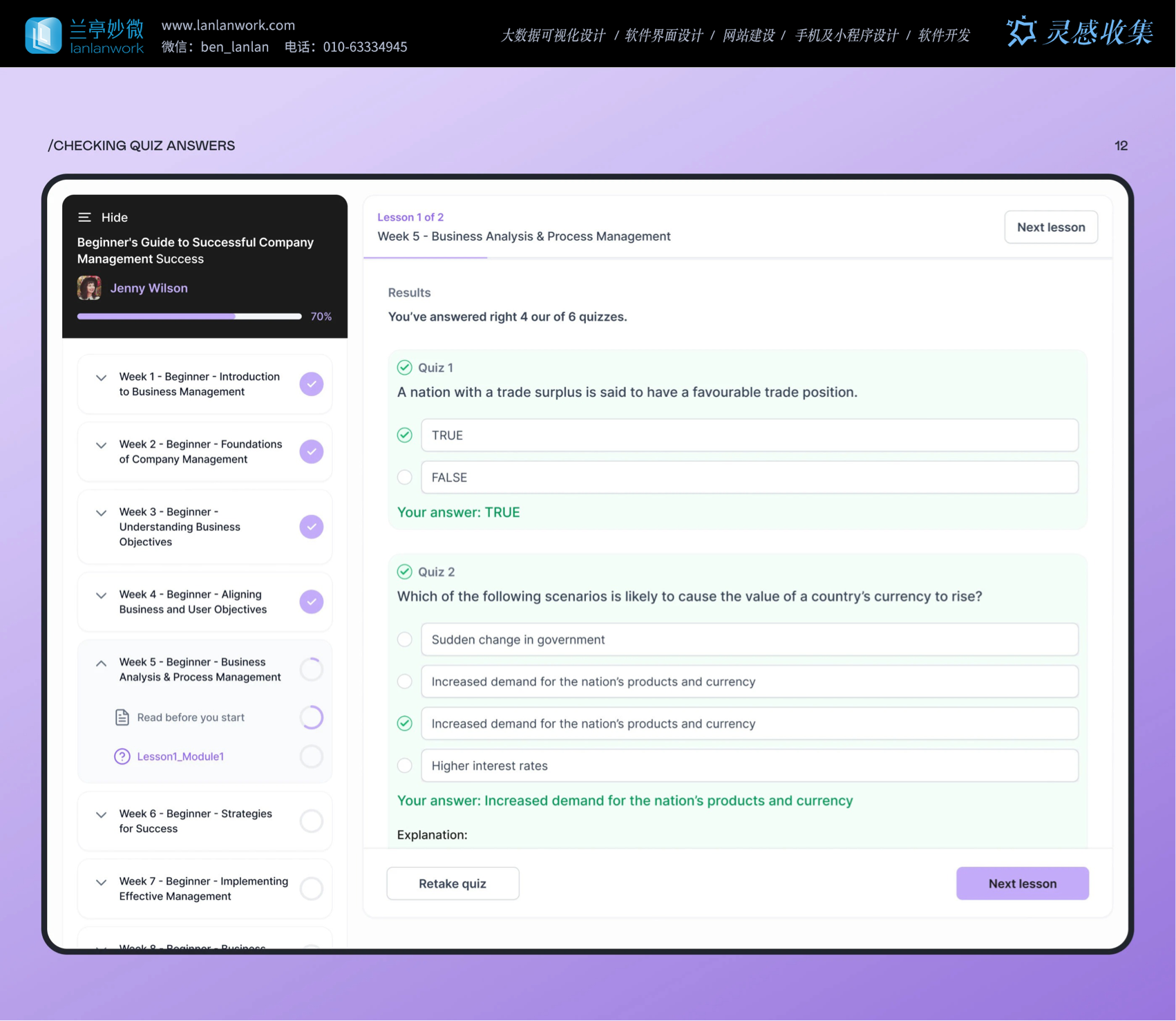 交互設(shè)計(jì)處處為用戶考慮。就說(shuō)測(cè)驗(yàn)功能,學(xué)生答題頁(yè)有 "Retakeequiz (重新測(cè)驗(yàn))""Next lesson (下一課)"