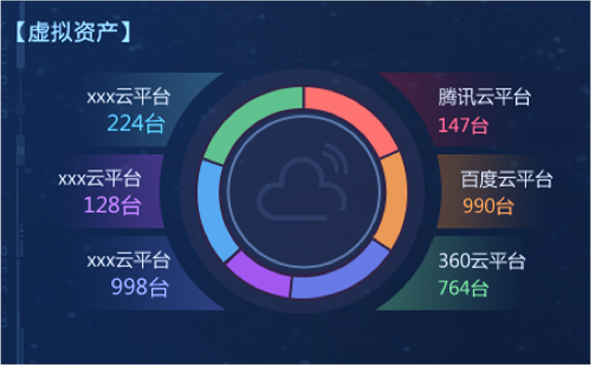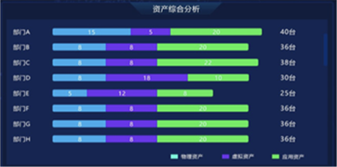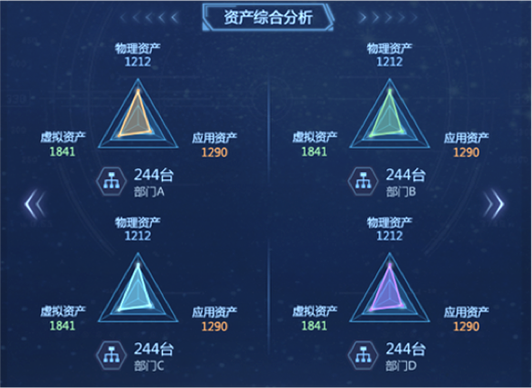 “資產(chǎn)綜合分析”模塊,以部門為單位,對企業(yè)“物理資產(chǎn)”“虛擬資產(chǎn)”“應用資產(chǎn)”數(shù)量統(tǒng)計分析,并展示各部門內(nèi)不同資產(chǎn)類型的比例關(guān)系和總量。在設(shè)計版本中,我們改變模塊內(nèi)的布局和交互方式,以雷達圖方式展示部門內(nèi)部不同資產(chǎn)類型的數(shù)量關(guān)系和總量,并通過顏色來區(qū)分不同部間的數(shù)據(jù)。內(nèi)容擴展性方面,采用左右橫向翻頁樣式,可自由設(shè)定系統(tǒng)自動翻頁切換和手動點擊切換,不僅豐富了頁面展示方式,又增加交互趣味性,數(shù)據(jù)切換過程中動效的使用也進一步增加界面的科技感和“數(shù)據(jù)之美”。