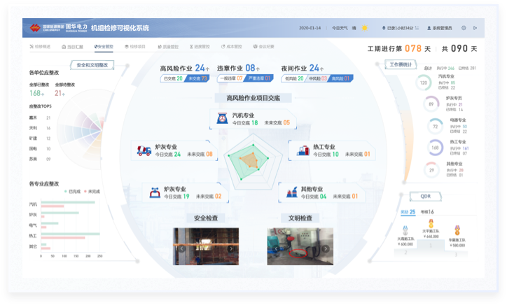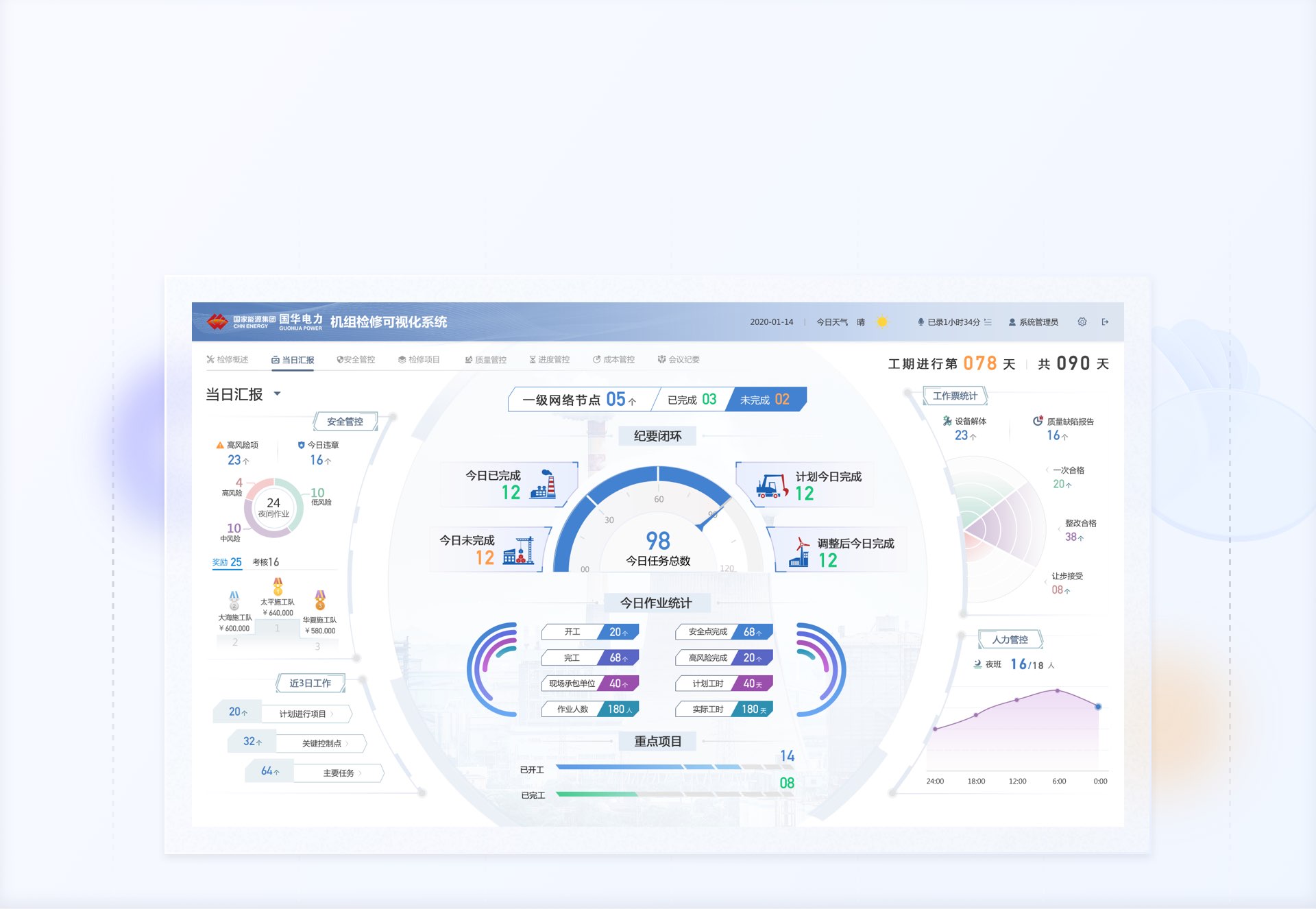頁(yè)面使用環(huán)繞式布局,頂部為導(dǎo)航欄,中間部分突出重要信息,“安全管控”“近3日工作”“工作票統(tǒng)計(jì)”“人力管控”四個(gè)板塊分布在周圍,有更好的視覺(jué)聚焦功能。