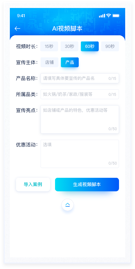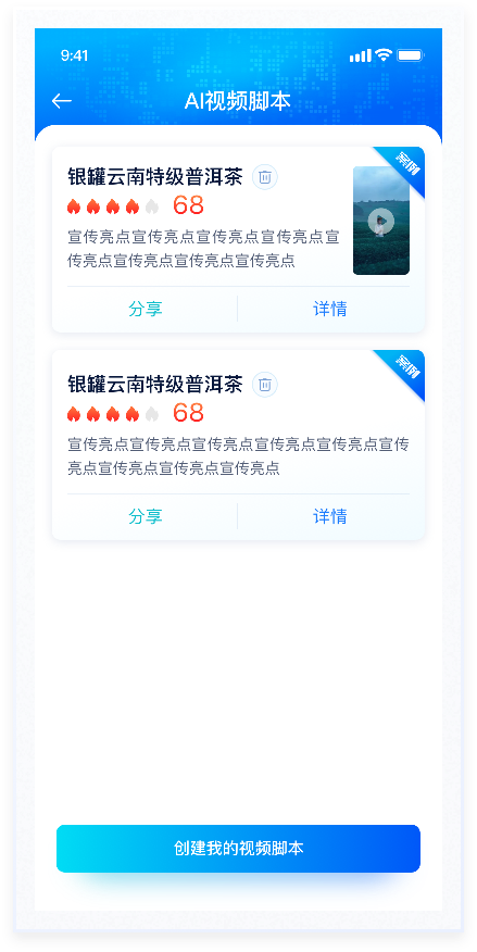 AI生成視頻腳本是用戶輸入相應(yīng)條件后,AI大模型通過(guò)系統(tǒng)算法生成視頻內(nèi)容。整體風(fēng)格較為科技感,因此在配色上使用藍(lán)色漸變及較重投影,符合產(chǎn)品屬性,能夠突出產(chǎn)品的創(chuàng)新性和先進(jìn)性。使用戶在使用過(guò)程中感受到強(qiáng)烈的視覺沖擊和沉浸感,這種體驗(yàn)有助于增強(qiáng)用戶對(duì)產(chǎn)品的興趣。