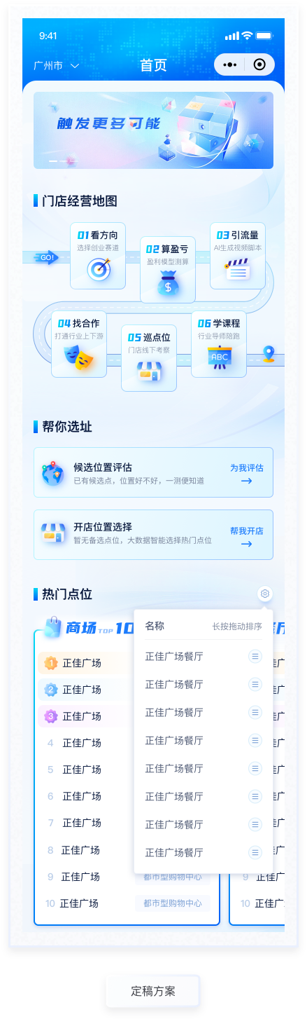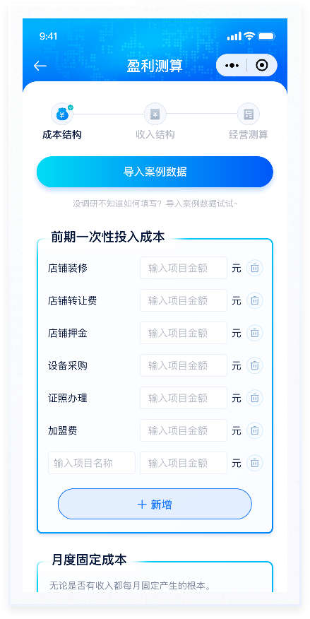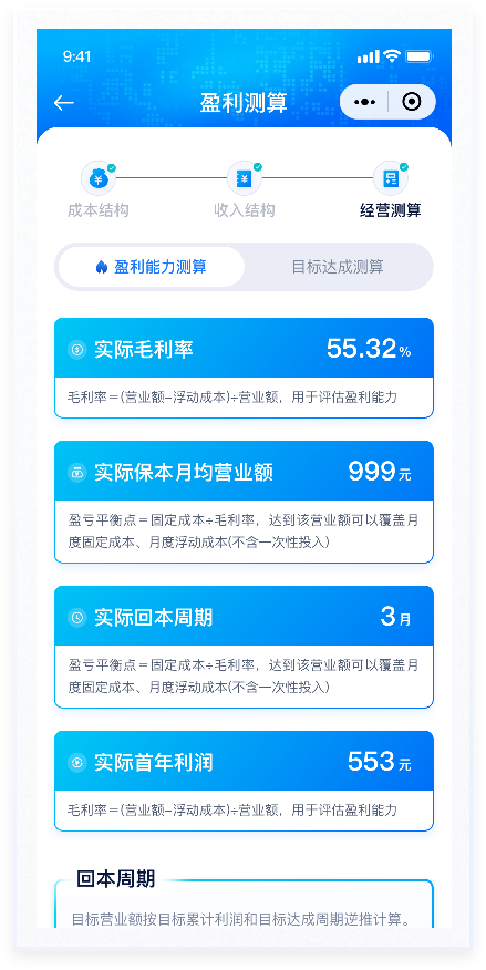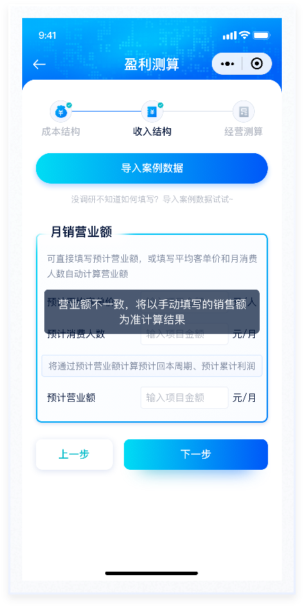 所盈利測(cè)算功能是產(chǎn)品的主要功能,通過(guò)AI對(duì)未來(lái)開店盈虧情況進(jìn)行預(yù)測(cè)評(píng)估。本次設(shè)計(jì)主要優(yōu)化該流程的交互及視覺表現(xiàn),整個(gè)流程分為“成本結(jié)構(gòu)”“收入結(jié)構(gòu)”“經(jīng)營(yíng)測(cè)算”三個(gè)階段,過(guò)程填寫情況放置在頁(yè)面頂部,一步了然。已填寫使用主題色標(biāo)注,未填寫則使用置灰顏色處理,符合用戶基本感知。按鈕使用與主色相近的漸變色。