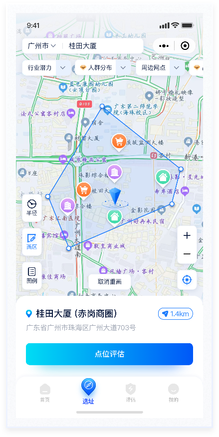按鈕換膚在地圖上,“半徑”“選區(qū)”便于用戶對(duì)開店范圍的選擇,“圖例”則更側(cè)重圖標(biāo)說(shuō)明性?!胺糯蟆薄翱s小”“定位”則是對(duì)顯示內(nèi)容的操作。