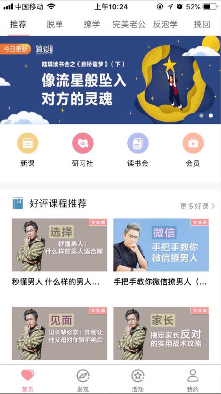 1.首頁根據(jù)產(chǎn)品的不同特色,設(shè)置了二級(jí)導(dǎo)航,將、脫單、撩學(xué)、完美老公、 反泡學(xué)、挽回等分類作為二級(jí)導(dǎo)航標(biāo)題,既能用來統(tǒng)一呈現(xiàn)特色內(nèi)容,又能保證頁 面信息的層級(jí)關(guān)系清晰明了;